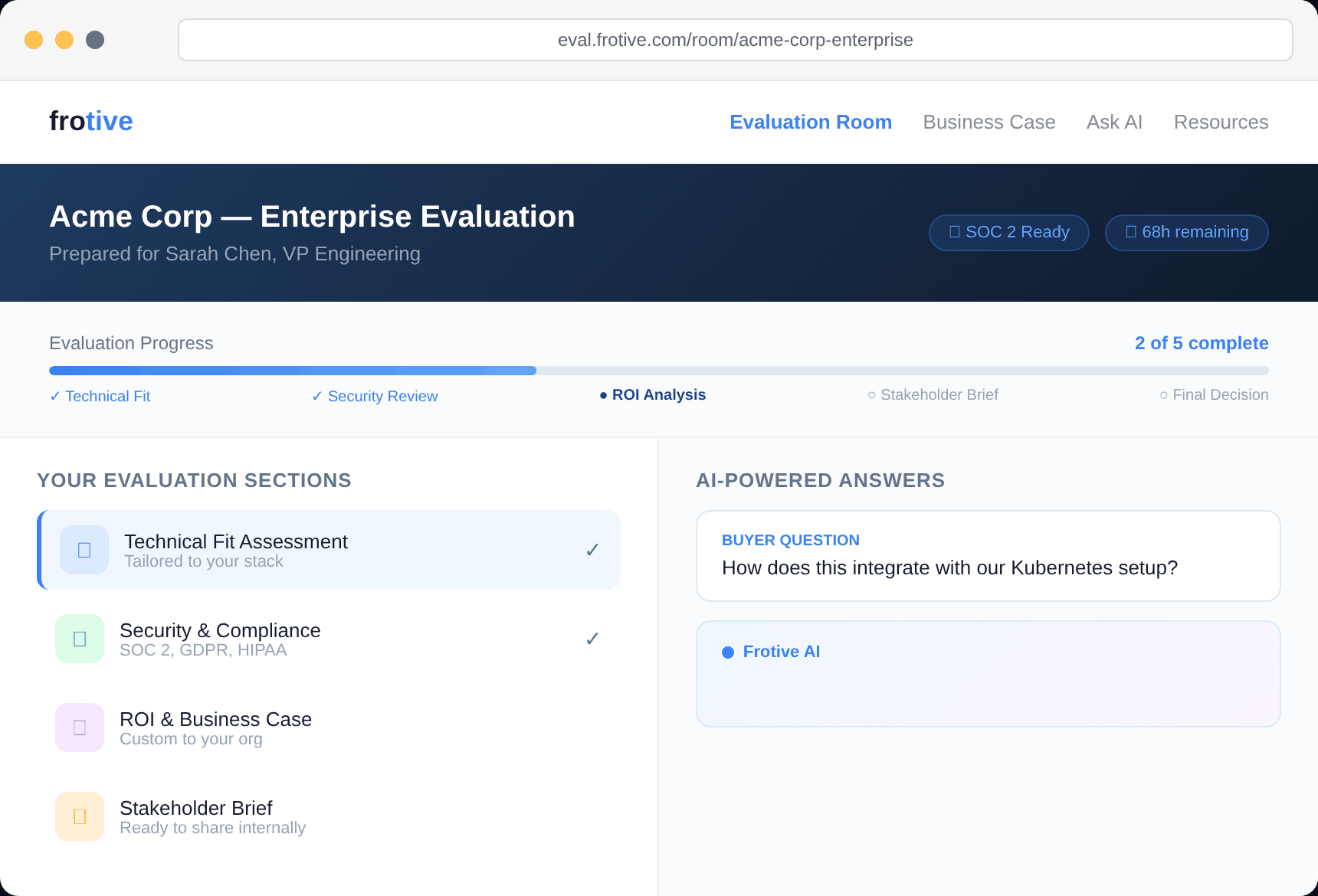 They are AE-facing pipeline tools with a buyer view. We are a buyer-first evaluation environment with an AE control layer. That distinction determines everything downstream. Frotive knows what makes buyers buy.