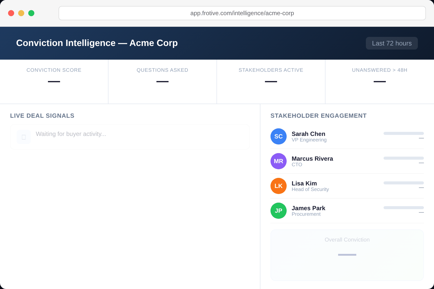 Enterprise deals don't die because the product is wrong. They die because the evaluation phase bleeds time and trust. Frotive gives every AE an AI sales engineer for every deal - deployed in 90 seconds, built around the 72 hours after your demo.